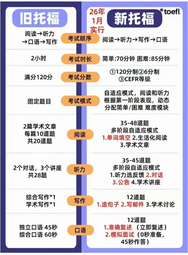 也就是说第一阶段发挥失常的考生仍有机会在第二阶段提高分数!2026年托福改革前后对比明显,明年27fall托福考生注意提前了解。
